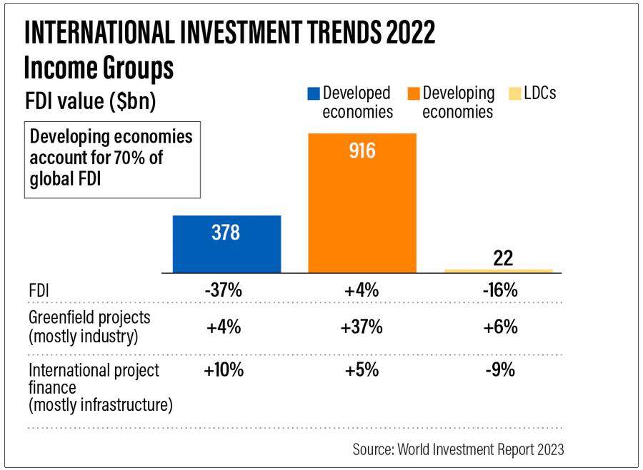 UNCTAD表示,为了接近将全球变暖限制在比工业化前水平高1.5°C的目标,从现在到2050年,世界需要大约是目前全球国内生产总值的一倍半的投资。然而,在经历了2020年的急剧下降和2021年的强劲反弹之后,全球外国直接投资在2022年下降了12%,至1.3万亿美元。