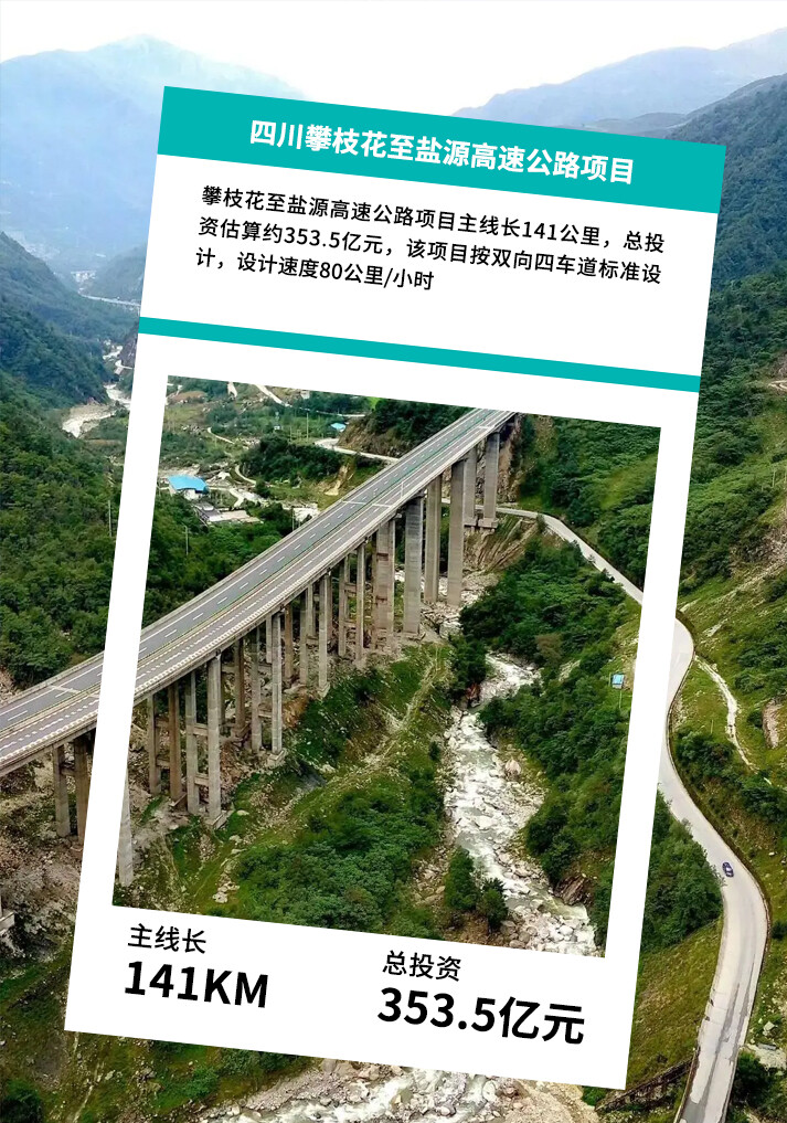 攀枝花至盐源高速公路项目起点位于G4216丽攀高速公路攀枝花半边街枢纽互通,经攀枝花市西区、仁和区、盐边县至凉山州盐源县,设白家枢纽互通与G7611西香高速公路相接。项目主线长141公里,攀枝花市境内长95公里,凉山州境内长46公里,总投资估算约353.5亿元,按双向四车道标准设计,设计速度80公里/小时。