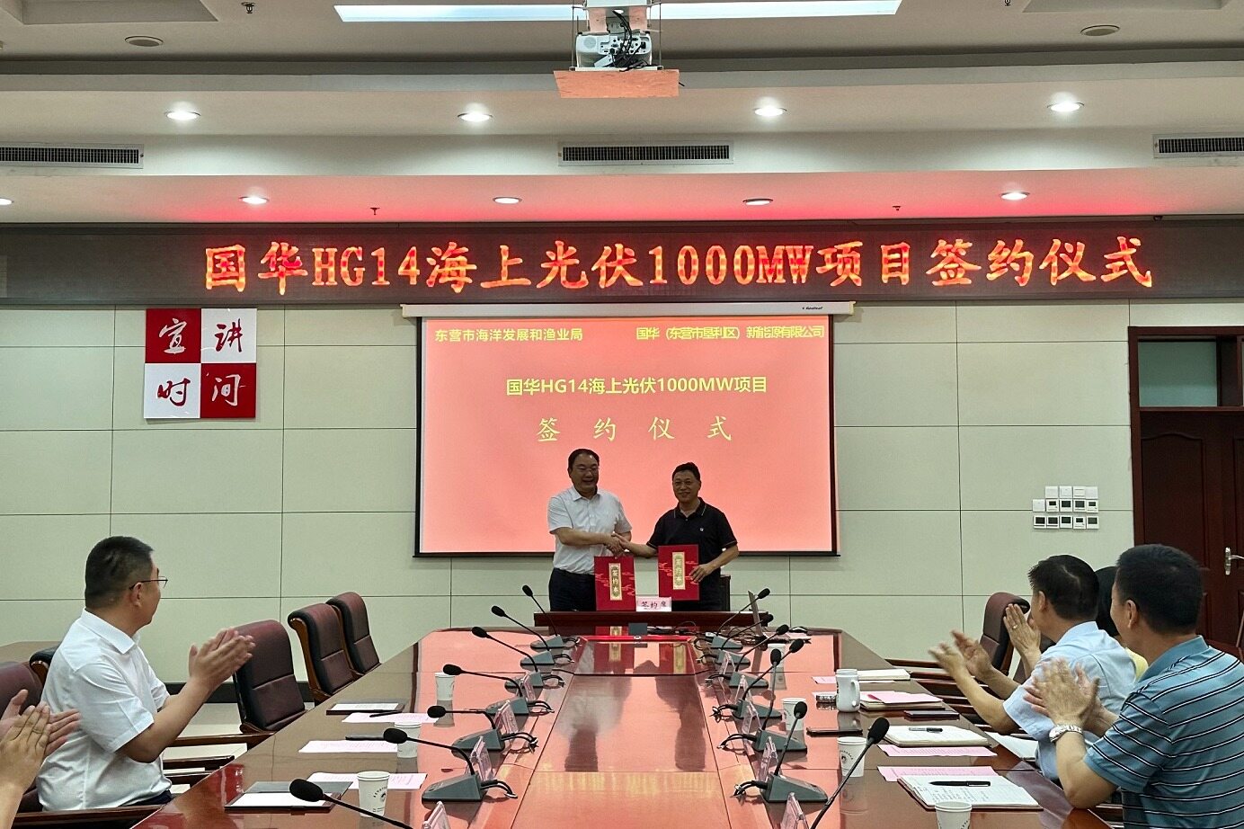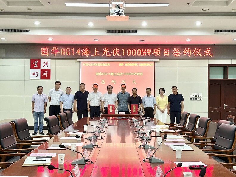 近日,国华能源投资有限公司国华HG14海上光伏1000MW项目签约仪式在市海洋发展和渔业局举行,国华投资管理有限公司与东营市海洋发展和渔业局签署项目合作协议。市海洋发展研究院院长王进河、市海洋和渔业监督监察支队三级调研员李国富、国华能源投资有限公司山东分公司党委委员、副总经理陈斌等出席签约仪式。