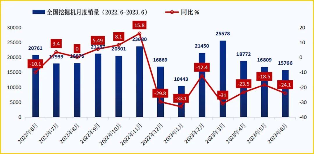 受前期疫情影响,工程机械行业进入下行周期,2023年挖机销售旺季不旺,出口平滑内需不足。近日,6月份挖掘机销售数据出炉,据中国工程机械工业协会对挖掘机主要制造企业统计,2023年6月销售各类挖掘机15766台,同比下降24.1%,其中国内6098台,同比下降44.7%;出口9668台,同比下降0.68%。