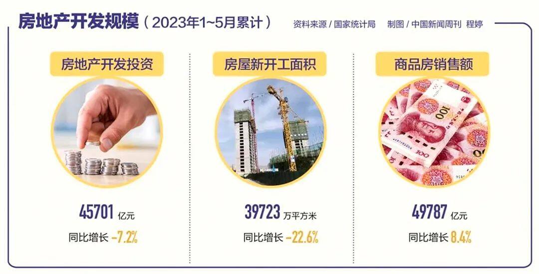 6月15日,国家统计局公布,2023年1—5月,房地产开发投资增速、房地产开发企业到位资金增速与房地产开发景气指数等均出现不同程度下滑。例如,房地产开发投资前5月仅有45701亿元,同比下降7.2%,连续3个月出现下滑;同期房屋新开工面积39723万平方米,同比下降22.6%。可见房地产开发投资的下滑依然没有见底。