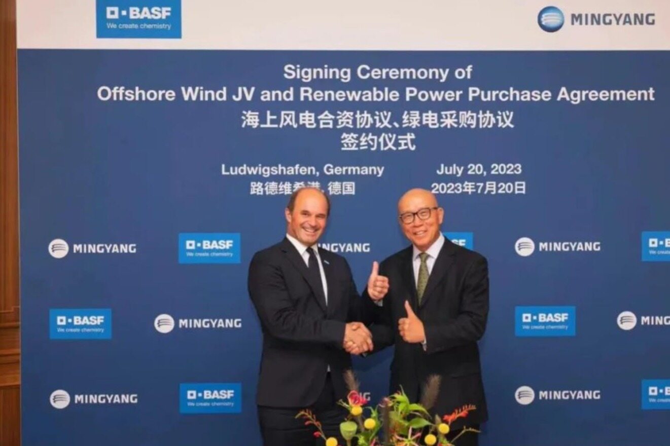 2023年7月21日巴斯夫与明阳达成协议计划在华南共同建设运营海上风电场,并成立合资公司湛江明阳巴斯夫新能源有限公司。其中,明阳将持股90%,巴斯夫持股10%。该风电场位于广东省湛江市,总装机容量为500兆瓦。经相关部门批准后,该风电场预计将于2025年全面投入运营,其发电量将主要为巴斯夫湛江一体化基地提供可再生能源电力。