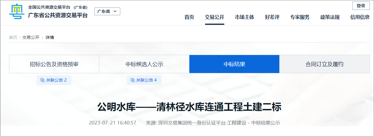 2023年7月21日,全国公共资源交易平台发布了公明水库——清林径水库连通工程土建二标中标候选人公示,具体情况如下: