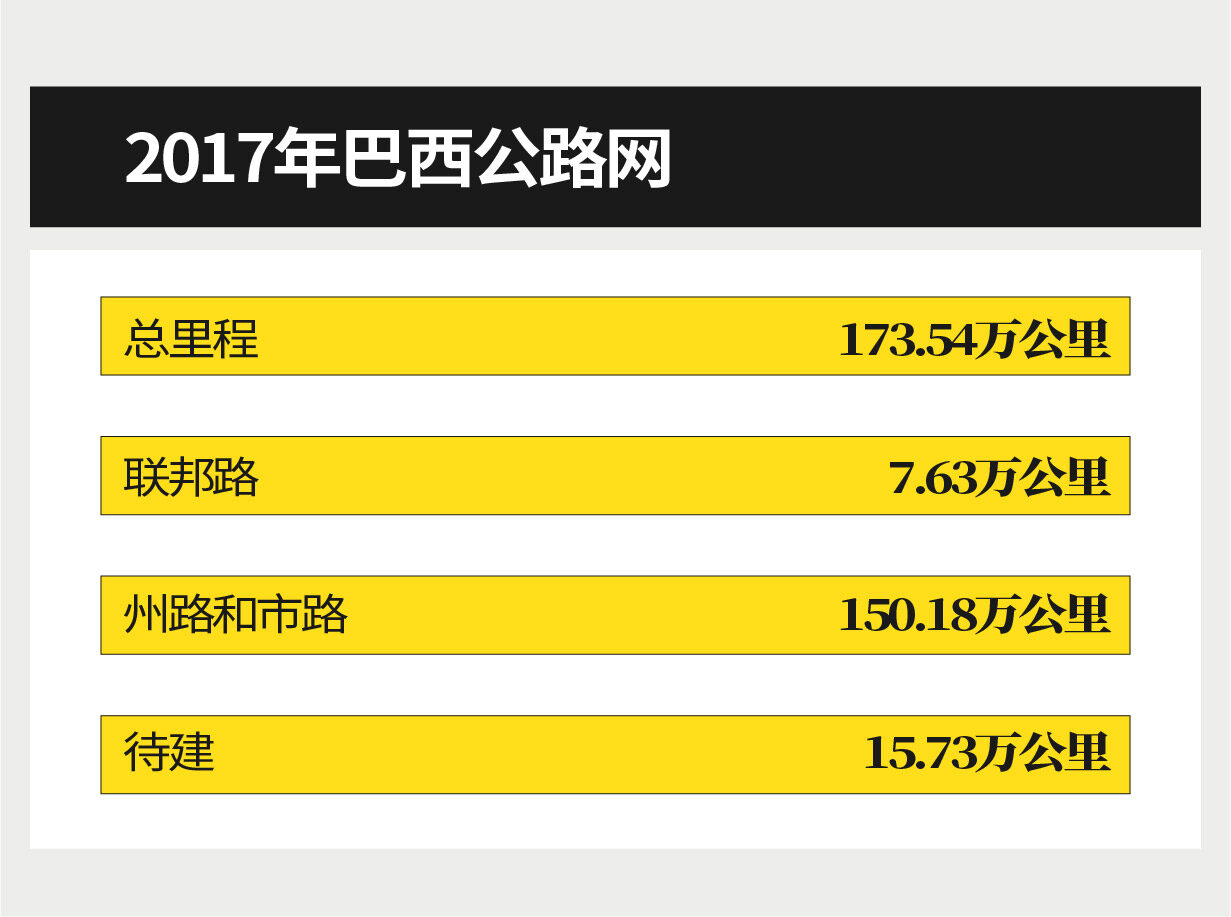 巴西作为西半球最大的新兴经济体的代表,无论是人口数量还是国土面积,在全球范围内都是属于比较靠前的国家。巴西公路总长172万公里,承担全国逾三分之二的货物运输量,其中有21.9万公里柏油路,高速公路约1.4万公里。巴西与周边国家基本实现公路互联互通,但有些公路路状条件有待改善。(转载请注明见道网www.seetao.com)见道网机械栏目编辑/邢文涛