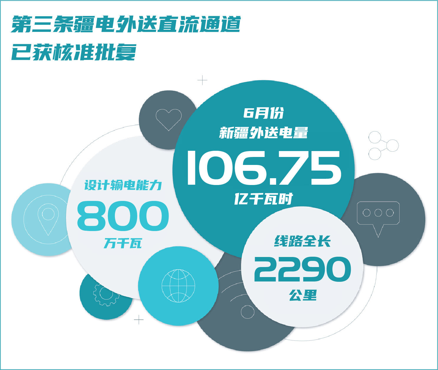 2010年,新疆建成疆电外送第一通道哈密—敦煌750千伏输变电工程,新疆电力首次实现外送。截至目前,新疆形成了两交两直疆电外送四通道格局。