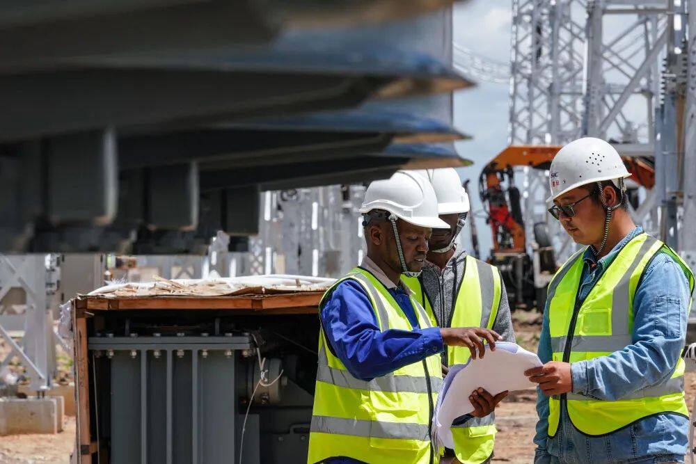 在肯尼亚马查科斯郡孔扎变电站建设工地,32岁的电气工程师大卫·马伊纳·卡莫雷手拿图纸和卷尺勘察测量、检查线路铺设,和同事一起投入到孔扎变电站的建设中。