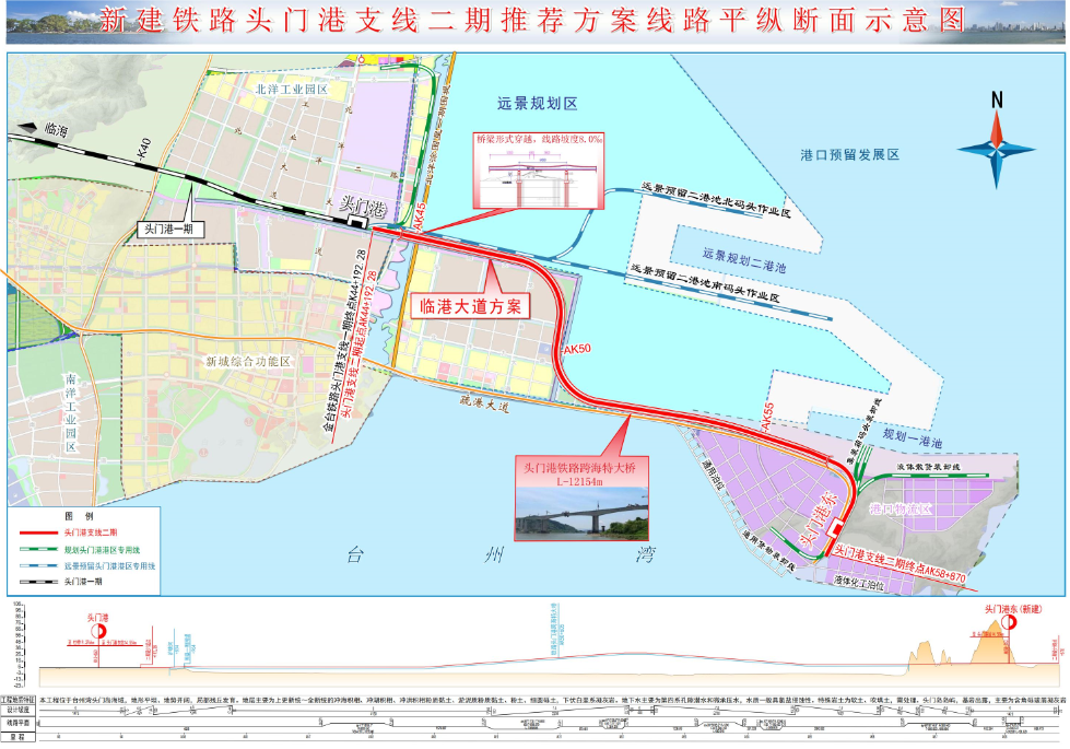 头门港支线二期头门新区至头门港段项目建设规模线路自头门港支线一期头门港站引出,往东延伸跨北洋一期围堤,行至规划临港大道前,折向南沿临港大道西侧的潮汐缓冲区走行,行至疏港大道前,折向东于疏港大道北侧平行往东,登头门岛后,设置头门港东站。