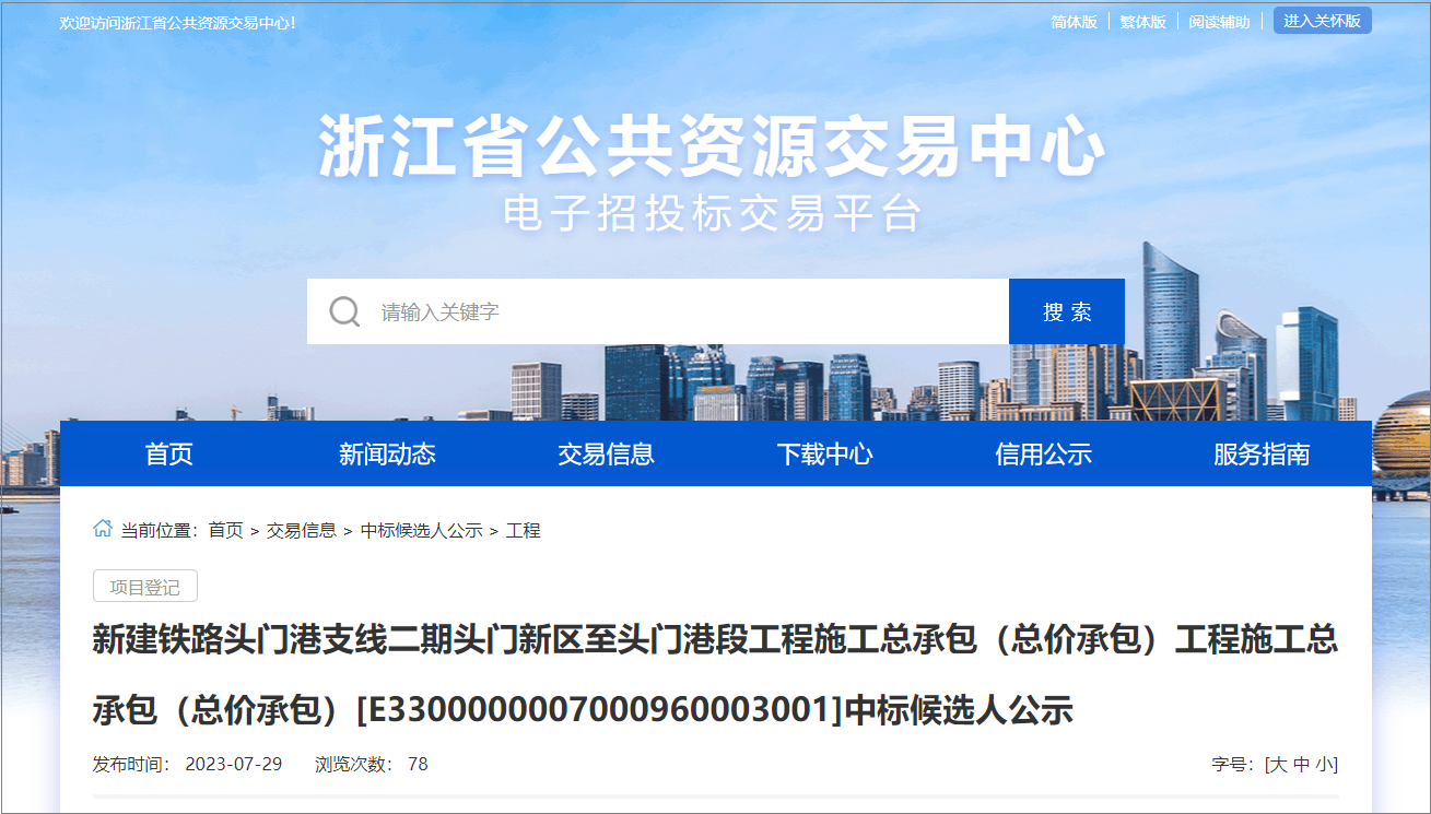 2023年7月29日,新建铁路头门港支线二期头门新区至头门港段-工程施工总承包中标结果公示在浙江省公共资源交易中心发布。该项目建成后,将经金台铁路、既有沪昆铁路向北连接杭州枢纽,沟通上海、江苏,往西通往江西并向中南、西南等内陆腹地辐射,对金台铁路具有深远意义。