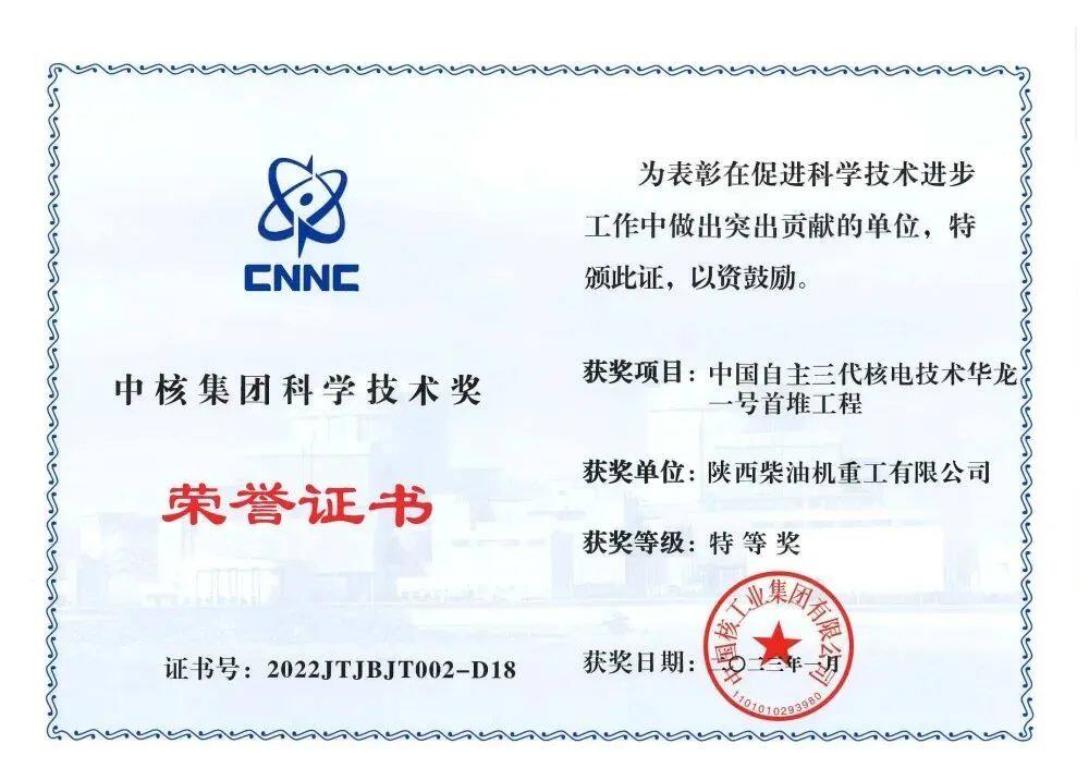 2023年,陕柴参与建设的重大科技成果——中国自主三代核电技术“华龙一号”首堆工程,荣获中核集团科学技术奖特等奖,公司也当选为中国核电“华龙一号”供应链联盟会员单位。目前,陕柴核电产业已成为企业发展的支柱产业,创造经济价值数十亿元,陕柴核电产品占据国内核电市场75%以上的份额,陕柴用实力为国家核电安全保驾护航。