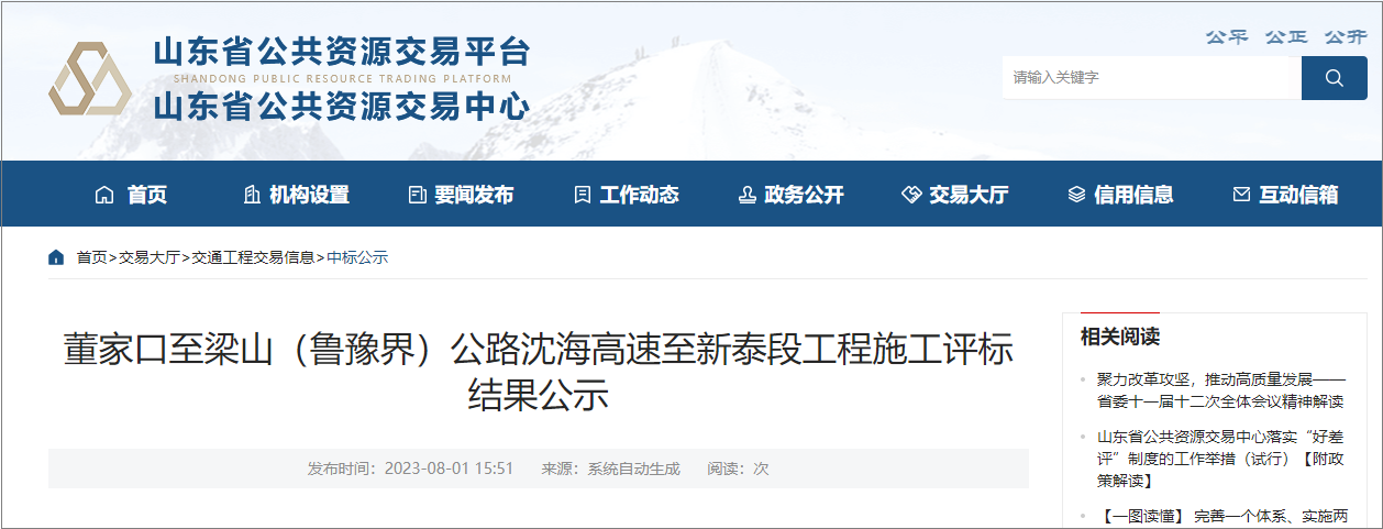 2023年8月1日,山东省公共资源交易平台发布了董家口至梁山公路沈海高速至新泰段工程施工评标结果公示,该项目共分为6个标段建设, 本次中标其中5个标段,投标总报价约119.8亿元。