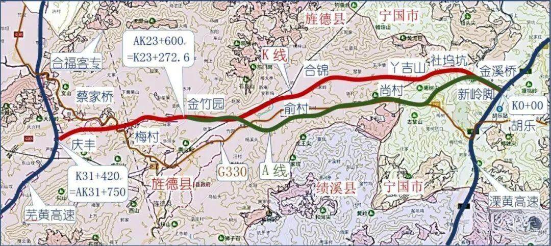 项目路线起点位于宁国市胡乐镇胡乐村北,路线呈东西走向,起点设置胡乐枢纽与G4012溧宁高速交叉。路线向西经霞乡村后,上跨浣溪河,然后沿芒成坞河布线,向西依次经芳岱村、杨林根村北、俞村北、土桥水库北后,与湾里村西侧设置旌德北互通衔接旌德县经开区经八路,再向西上跨华新路,随后设置隧道穿越柳山后,利用现状桥孔下穿合福高铁,先后上跨徽水河和G330,设置蔡家桥互通衔接G330,最终止于旌德县蔡家桥村庆丰村西,顺接S11芜黄高速旌德互通。