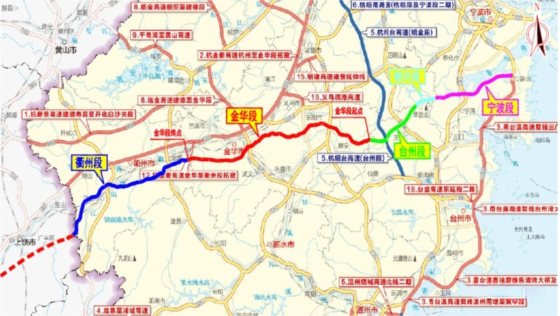 甬金高速公路改扩建工程宁波至金华段(金华段)起于绍兴嵊州市长乐镇与金华东阳市虎鹿镇老路交界点,起点桩号K115+650。路线出白峰岭隧道至东阳虎鹿镇,经巍山镇、六石街道、江北街道进入义乌廿三里街道,再经江东街道、佛堂镇、义亭镇进入金东区傅村镇,终点设傅村枢纽接杭金衢高速,终点桩号K185+386。