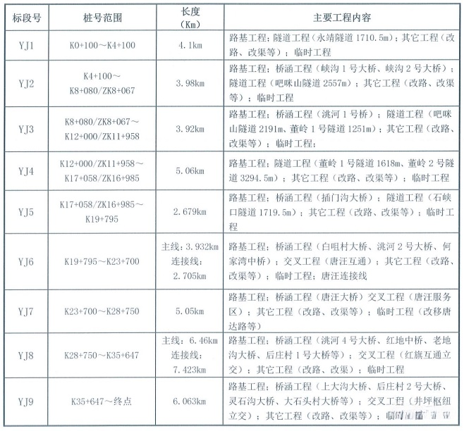 YJ1中标人:陕西路桥集团有限公司,中标价:3.8亿元;YJ2标中标人:甘肃路桥建设集团有限公司中标价:4亿元;YJ3标中标人:中铁二十三局集团有限公司,中标价:5亿元;YJ4标中标人:四川公路桥梁建设集团有限公司,中标价:5.4亿元;YJ5标中标人:中铁二十一局集团第三工程有限公司,中标价:3.8亿元YJ6标中标人:中铁二十局集团有限公司,中标价:3.7亿元YJ7标中标人:中海外交通建设有限公司,中标价:3.5亿元;YJ8标中标人:山东省路桥集团有限公司,中标价:38032.6217万元;YJ9标中标人:中铁三局集团有限公司,中标价:3.6亿元。