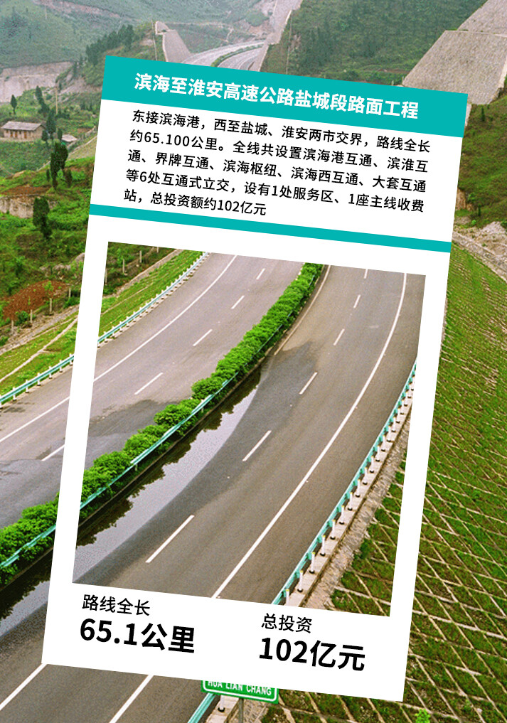 滨海至淮安高速公路起点位于盐城市滨海港区,终点位于淮安市涟水县,本项目为盐城段。滨海至淮安高速公路盐城段项目工程范围为东接滨海港,西至盐城、淮安两市交界,路线全长约65.100公里。全线共设置滨海港互通、滨淮互通、界牌互通、滨海枢纽、滨海西互通、大套互通等6处互通式立交,设有1处服务区、1座主线收费站,总投资额约102亿元。