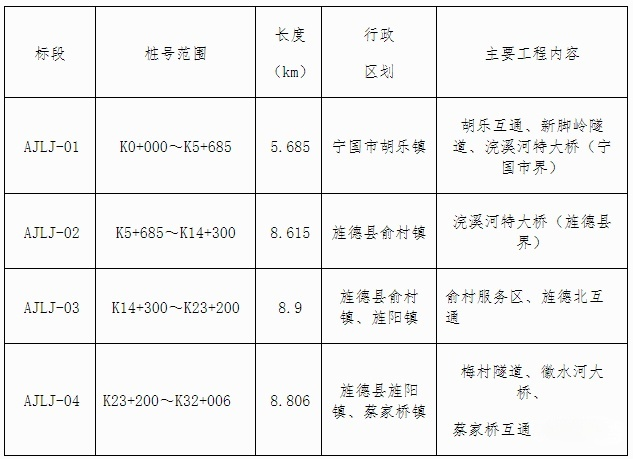 AJ-01标段中标人:安徽省公路桥梁工程有限公司,AJ-02标段中标人:中交第三公路工程局有限公司;AJ-03标段中标人:中交隧道工程局有限公司;AJ-04标段中标人:安徽开源路桥有限责任公司。