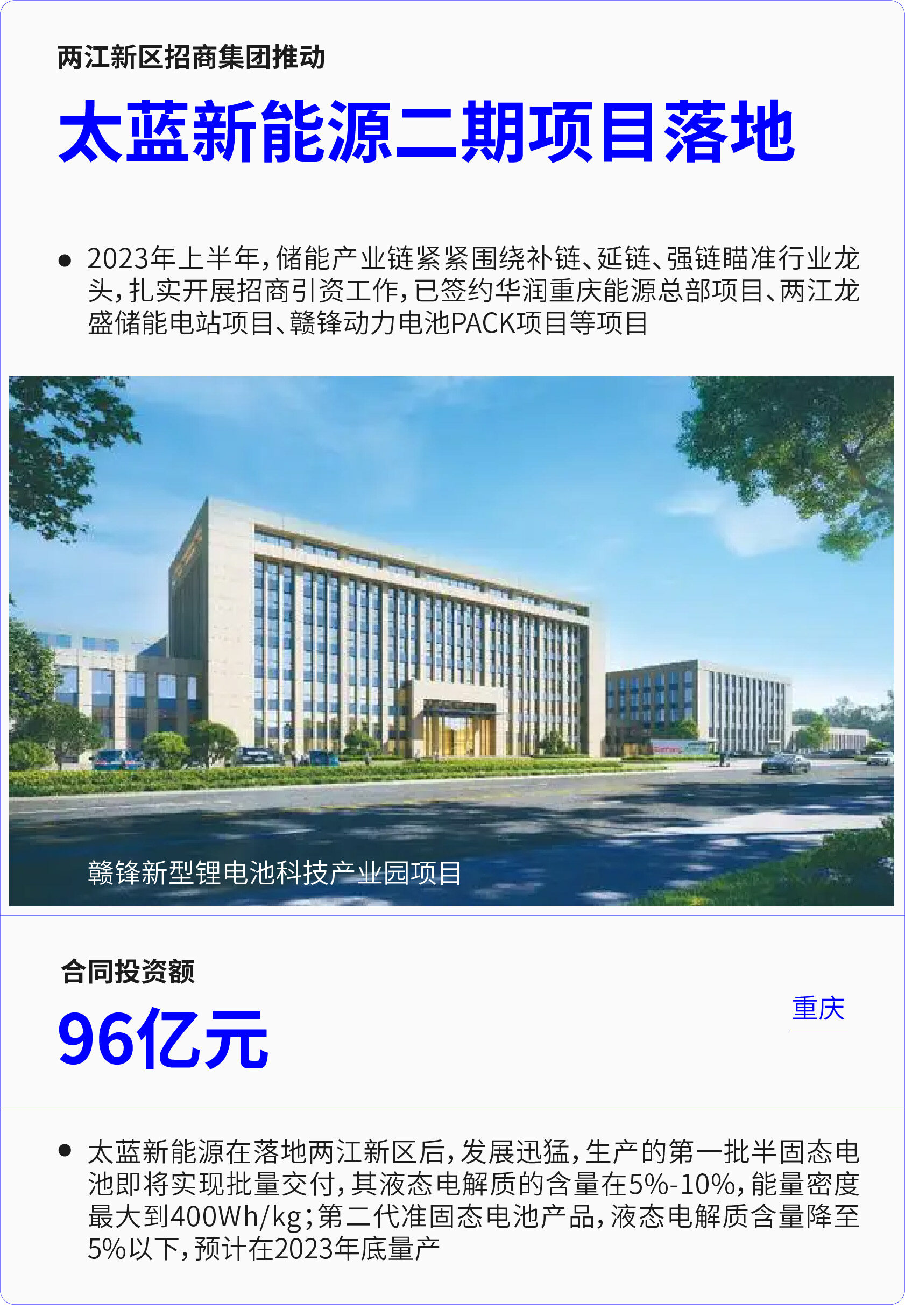 为抢先布局固态电池新赛道,培育本地潜在独角兽企业,两江新区招商集团充分发挥拨投结合创新模式的作用,推动太蓝新能源二期项目落地。