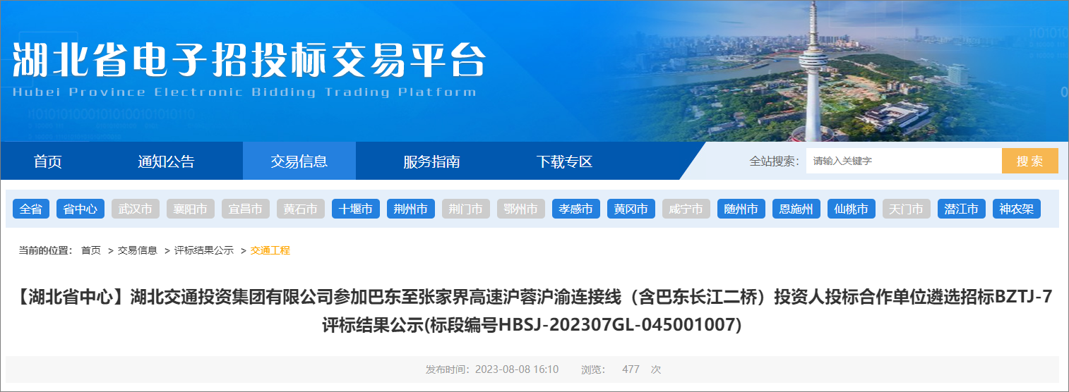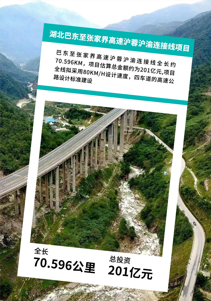 2023年8月8日,湖北省电子招投标交易平台发布了巴东至张家界高速沪蓉沪渝连接线投资人招标评标结果公示,该项目共分为7个标段建设,项目估算总金额约为201亿元。