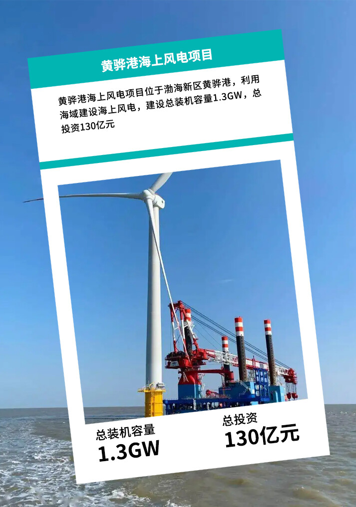 项目位于渤海新区黄骅港,利用海域建设海上风电,建设总装机容量1.3GW,总投资130亿元。