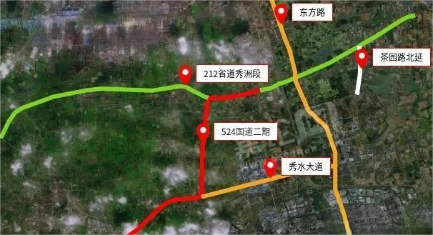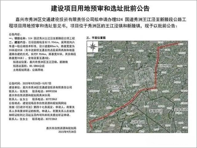 524国道秀洲王江泾至新塍公路工程,项目起点位于秀洲区王江泾镇腾云村(现状524国道腾云路口)与现状524国道相接,起点桩号K127+250,路线向西至范滩村,设置范滩交叉后转向南上跨申嘉湖高速后经东风村至沈家桥村设置沈家桥互通,连接新杨公路和秀洲大道,之后路线转向西南以高架形式跨越乍嘉苏高速,于嘉塍公路西侧设置一对平行匝道,连接嘉塍公路,路线以高架形式继续跨越嘉乌线航道、嘉铜公路、规划新塍大道、规划虹桥路、新陡线航道后至终点与524国道相接,终点桩号K143+154,主线全长约15.9km。