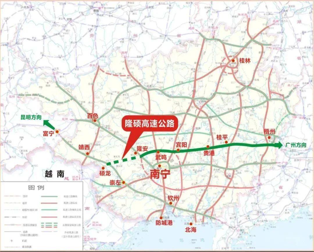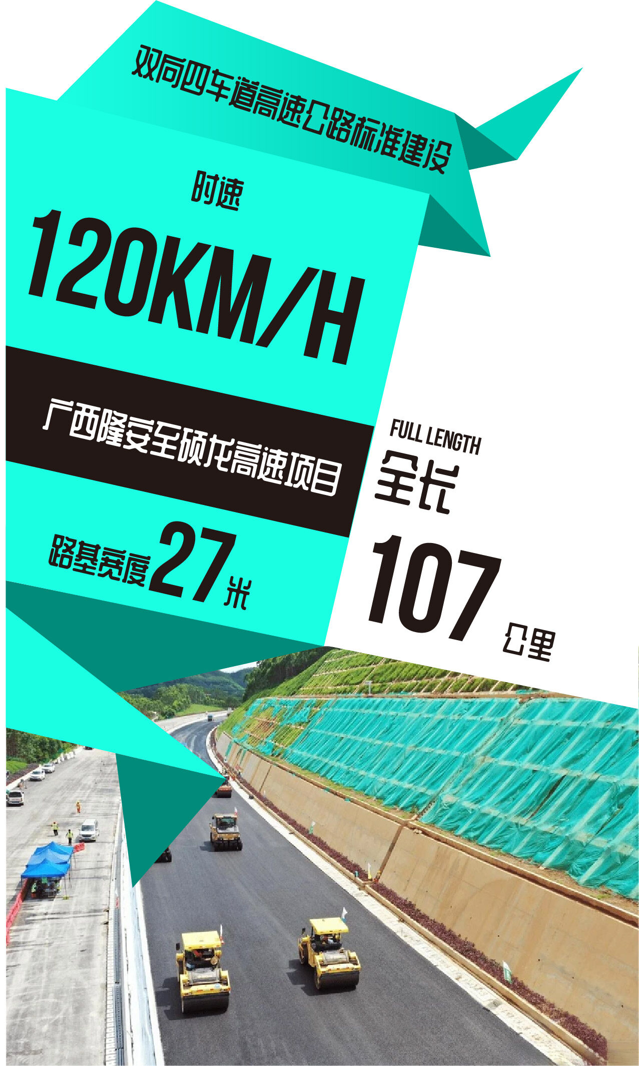 建设规模:广西隆安至硕龙高速公路,分为南宁境与崇左境,是广西高速公路网规划布局中“横4”—苍梧至硕龙高速公路的重要组成部分,项目起点位于南宁市隆安县那桐镇,顺接贵隆高速,终点与崇靖高速新建枢纽相交,同时于K104+353设置福新互通与天等至硕龙公路相接,通达硕龙口岸,主线全长约107公里,路面为沥青混凝土路面,采用双向四车道高速公路标准建设,路基宽度27米,设计时速120公里,其中路基挖方4053.2万立方米、填方2612万立方米、桥梁21.25公里/90座、涵洞132道、通道110道、隧道13.145公里/32座、互通式立交7座、服务区4处、停车区1处、养护工区1处、管理分中心1处,匝道收费站6座全线设置桥梁10650.4米/33座,隧道10267米/13座,桥隧比42.28%。同步建设龙虎山连接线和大新连接线。