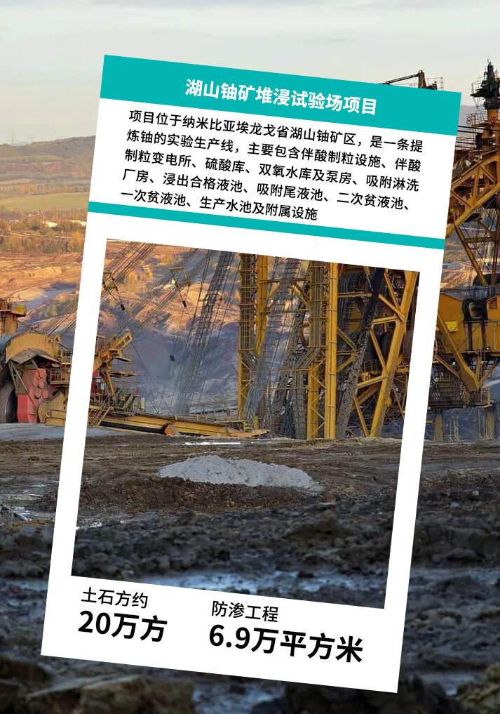 湖山铀矿堆浸试验场项目:项目位于纳米比亚埃龙戈省湖山铀矿区,土石方约20万方,防渗工程6.9万平方米,该项目是一条提炼铀的实验生产线,主要包含伴酸制粒设施、伴酸制粒变电所、硫酸库、双氧水库及泵房、吸附淋洗厂房、浸出合格液池、吸附尾液池、二次贫液池、一次贫液池、生产水池及附属设施。