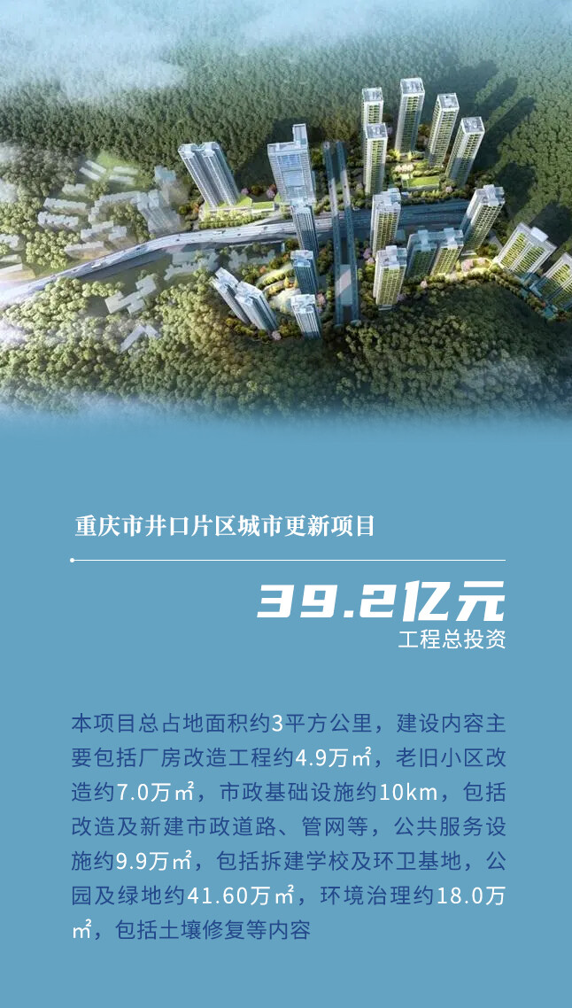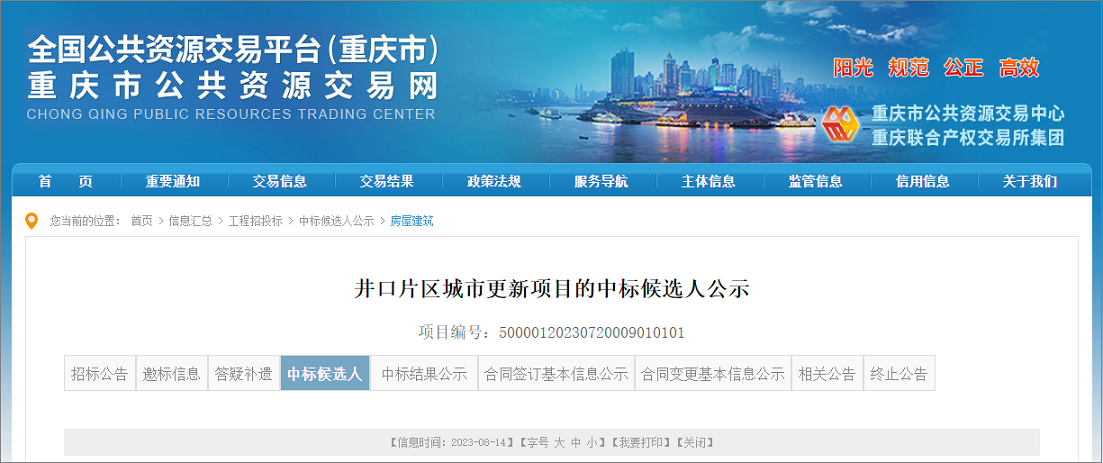 2023年8月14日,重庆市公共资源交易网发布了井口片区城市更新项目中标候选人公示,本项目由中交重庆投资发展有限公司牵头的联合体中标,工程总投资约39.2亿元,工程建设费用约24.2亿元。