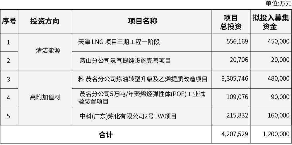 茂名分公司炼油转型升级及乙烯提质改造项目:本项目预计投资总额 3,305,746 万元,拟使用募集资金投入 480,000 万元。本项目建设内容包括炼油转型升级部分和乙烯提质改造部分。本次募集资 金主要投入乙烯提质改造部分中的热塑性高分子新材料装置等高附加值材料相关方向,产品主要用于新能源汽车、精密仪器、电子电器等领域。