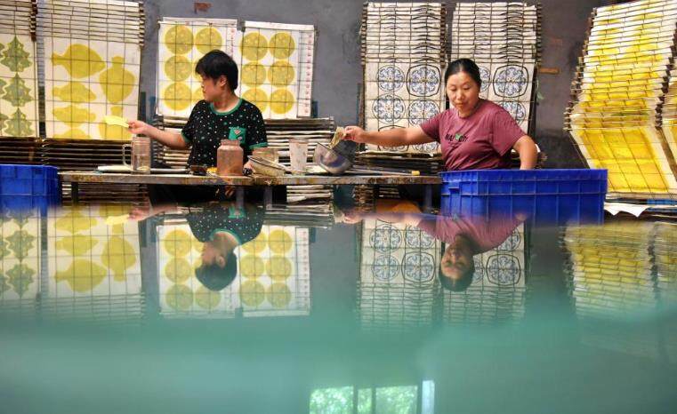 8月15日在山东省淄博市沂源县悦庄镇东埠村一玻璃制品企业工人对玻璃进行贴画加工