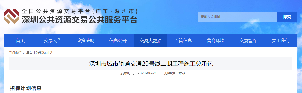 2023年8月18日,深圳市公共资源交易中心发布了深圳市城市轨道交通20号线二期工程施工总承包招标公告。这意味着,地铁20号线二期建设即将迎来施工阶段,按照计划,该线路预计2023年年内开工建设,项目总投资221.1亿元。