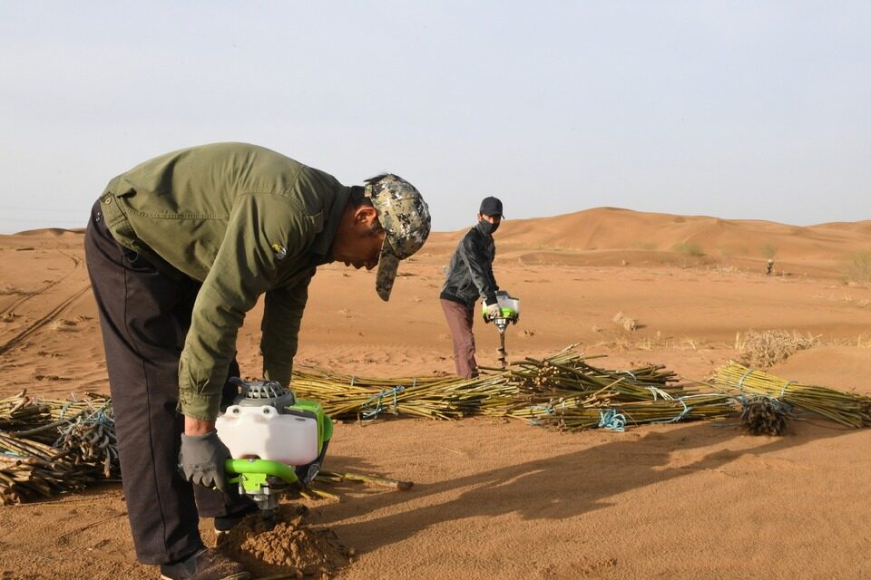 在位于鄂尔多斯市杭锦旗的库布其沙漠腹地,治沙工人为与会者展示了微创气流植树技术用加压水枪喷射的水气流在沙地上冲出直径几厘米深一米的小洞,然后将树苗快速地种进去,只需10秒即可完成栽种。种植每棵树只需要3升水,苗木成活率可达90%以上。
