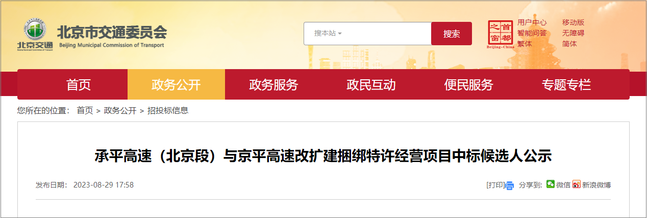 2023年8月29日,北京市交通委员会发布了承平高速北京段与京平高速改扩建捆绑特许经营项目中标候选人公示,该项目由国铁投资集团等5家单位中标,项目估算投资125.7亿元。