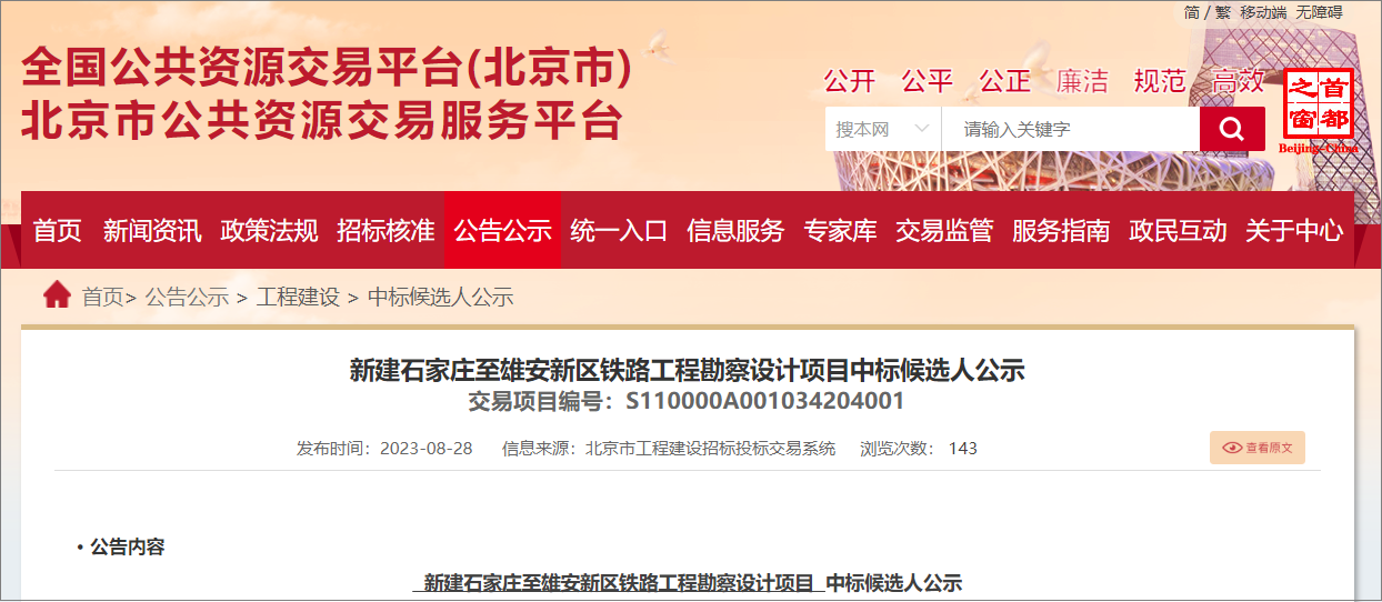 2023年8月31日,北京市公共资源交易服务平台发布了新建石家庄至雄安新区铁路工程勘察设计项目中标候选人公示,具体情况如下: