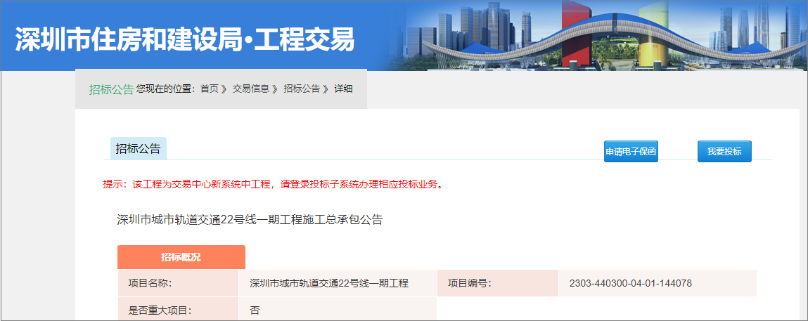 2023年8月31日,深圳市住房和建设局发布了深圳市城市轨道交通22号线一期工程施工总承包公告,该项目所属行业轨道交通,招标人深圳市地铁集团有限公司,项目总投资408.5亿元。