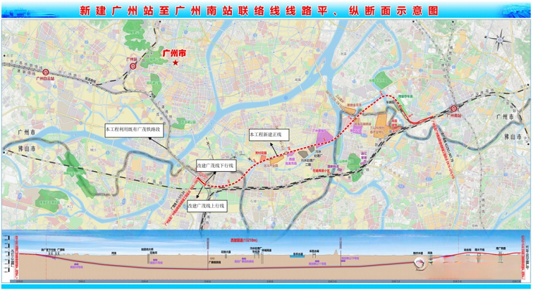 线路起自广州铁路枢纽广州站,利用既有广茂铁路至五眼桥线路所后,新建线路以隧道形式沿规划城市快捷路向南,引入广州南站,广州站至广州南站运营距离25.23公里,其中新建线路16.077公里,其中隧道13.21km, 桥梁1.093km,桥隧比88.97%。