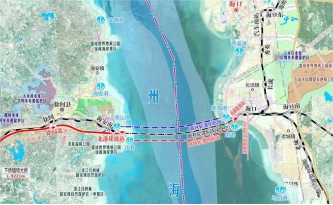 湛海高铁项目正线自湛江北站引出,向南经雷州市、徐闻县引入北港轮渡站,跨越琼州海峡至南港轮渡站,出站后接入海南环岛高铁,包括湛江至海安段铁路工程和琼州海峡过海轮渡工程两部分。琼州海峡过海轮渡工程目前采用“人过海”方案。