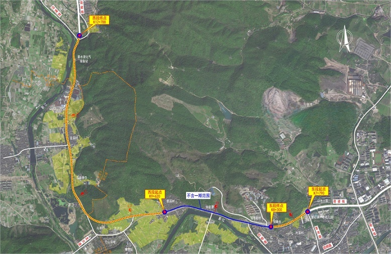 工程概况:工程实施范围东起官池墩路交叉口,沿现状荷梁线向西,终于章水镇口。路线全长约3.68公里。项目采用一级公路标准设计,双向四车道,设计速度:60公里/小时,计划建设工期24个月,概算总投资约8.01亿元。本项目地处海曙区鄞江镇、龙观乡、章水镇,第一段起点路线起于官池墩路交叉口,起点桩号为K7+790,终点位于宝峰池西侧,顺接项目一期,终点桩号K8+300。第二段起点位于周家村西侧,顺接项目一期,桩号为K9+620,终点位于章水镇镇口,桩号K12+778。