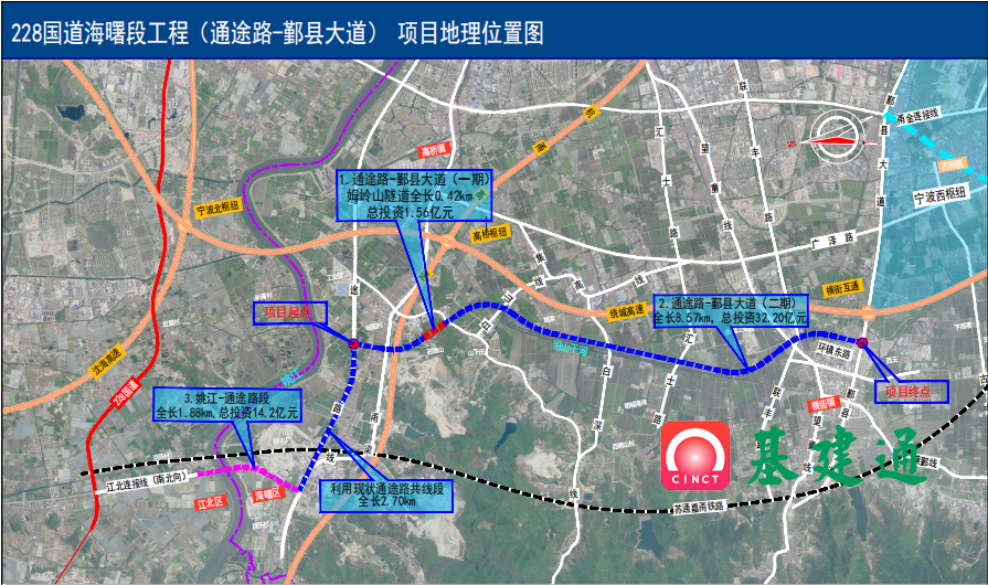 工程概况:工程分为南北两段,北段北起通途路,南至一期工程北侧隧道洞口,南段北起一期工程南侧隧道洞口,南至鄞县大道,全长约8.573公里,红线标准断面宽度为34-50米,道路等级为一级公路,设计速度80km/h,工程投资估算32.2亿元。