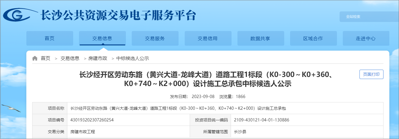 2023年9月12日,长沙公共资源交易电子服务平台发布了长沙经开区劳动东路黄兴大道-龙峰大道道路工程中标候选人公示,该项目总投资约49.75亿元。