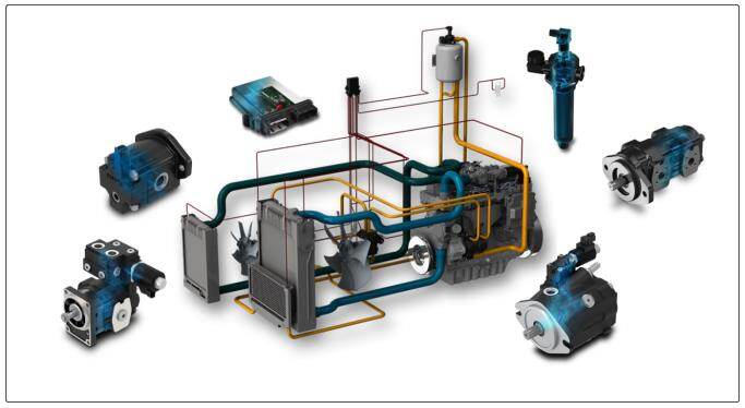 多重优势于一体的风扇系统,领先!液压泵和液压马达驱动,灵活的散热系统设计,实现精确控温,动力强、效率高、节能、降噪,集成方案,减小整体尺寸,风扇旋转方向可变,可独立控制多个风扇。