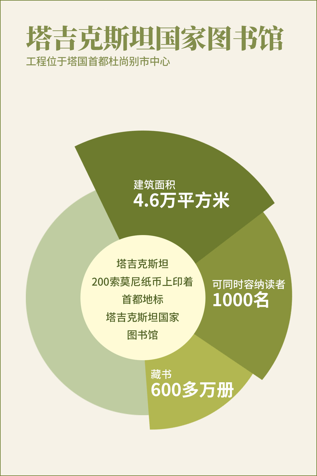 塔吉克斯坦200索莫尼纸币上印着首都地标塔吉克斯坦国家图书馆,工程位于塔国首都杜尚别市中心,项目建筑面积约4.6万平方米,图书馆藏书600多万册,可同时容纳1000名读者在此借阅图书。