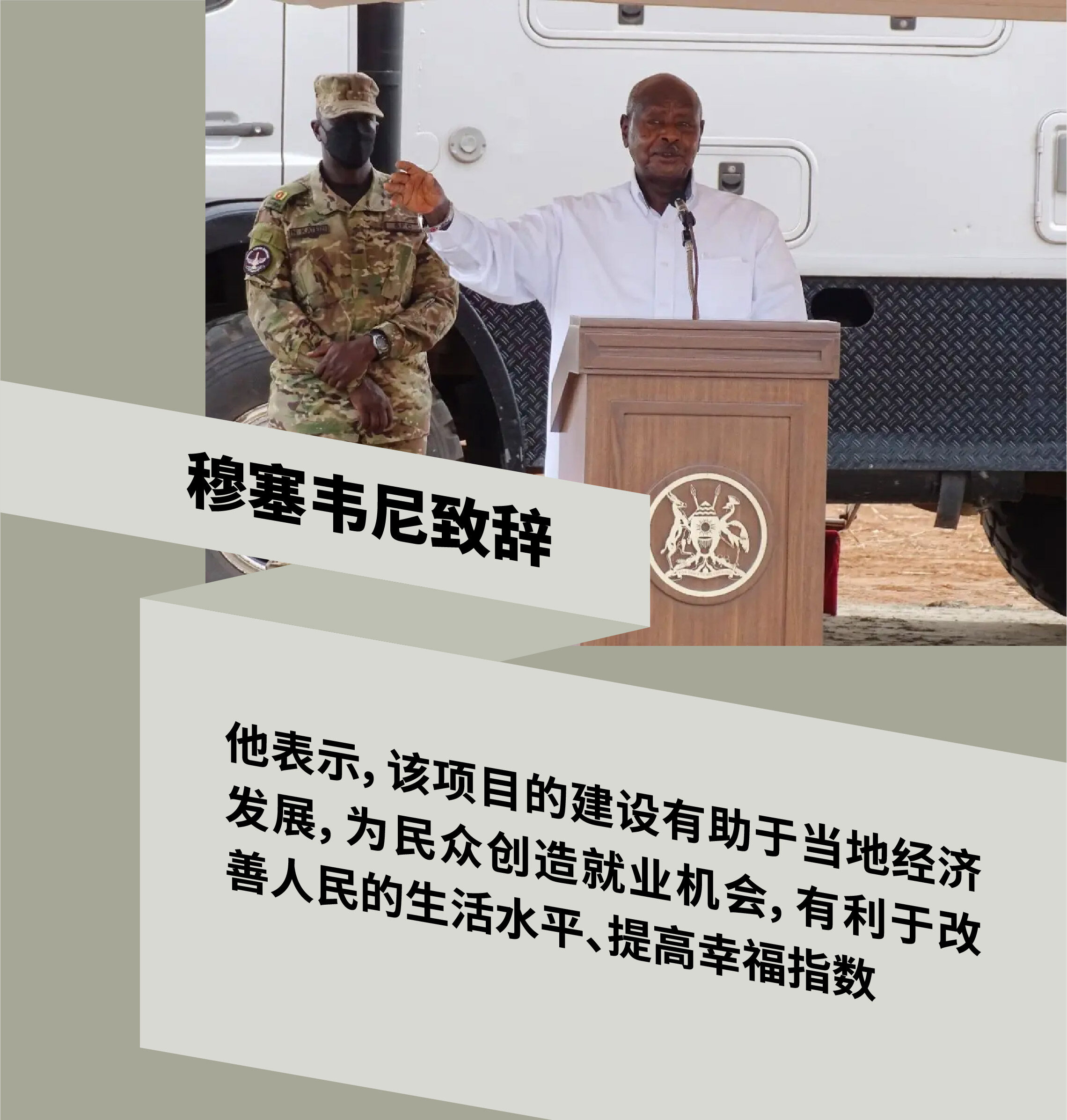 穆塞韦尼在致辞中,对中国西部国际控股集团投资、中铁二十局建设的水泥生产线给予高度赞赏。他表示,该项目的建设有助于当地经济发展,为民众创造就业机会,有利于改善人民的生活水平、提高幸福指数。乌干达政府将积极协调各类社会资源,全力帮助和支持水泥生产线建设,确保项目如期投产运营。