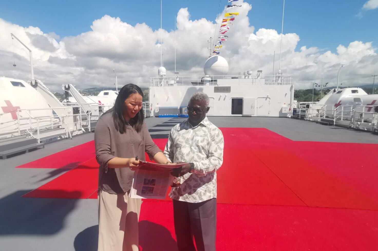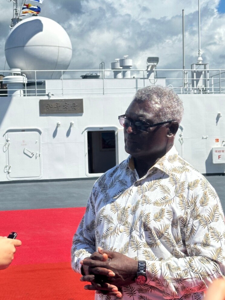 8月20日,索加瓦雷携夫人赴霍尼亚拉港参观正在访所的中国海军和平方舟号医院船。在饶有兴趣地参观舰船、体验中医诊疗后,索加瓦雷在甲板上欣然接受了记者的专访。