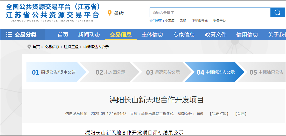 2023年9月12日,江苏公共资源交易平台发布了江苏:溧阳长山新天地合作开发项目中标候选人公示,标段合同估算价126.7亿元。