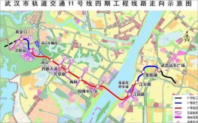 武汉市轨道交通11号线四期自汉阳站至白沙洲,是支撑城市东西向垂江发展的重要轴线。线路起于汉阳站,主要沿四新大道、规划道路,新武金堤路敷设,连接汉阳火车站、四新城市副中心及武昌白沙洲片区,止于11号线三期工程起点江安路站。线路全长16.2km,全地下敷设方式。设站6座,其中换乘站5座。续建汤山车辆段。