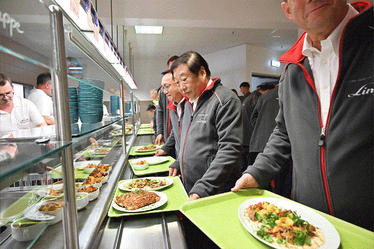 中午,谭旭光在凯傲叉车工厂与员工一同用餐。(此文出自见道官网www.seetao.com未经允许不得转载否则必究,转载请注明见道网+原文链接)见道网机械栏目编辑/高丽梅