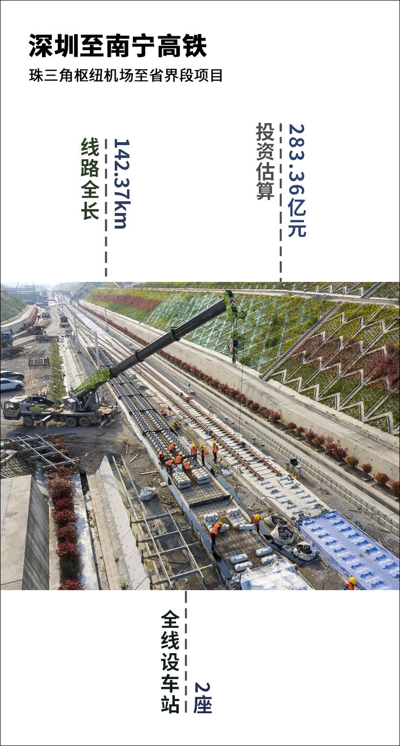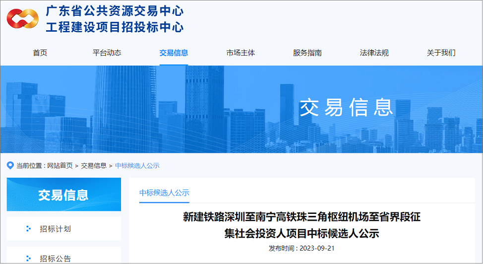 2023年9月21日,广东省公共资源交易中心发布了新建铁路深圳至南宁高铁珠三角枢纽机场至省界段征集社会投资人项目中标候选人公示,该项目由中铁建华南投资有限公司牵头的联合体中标,总工期暂定为4年,投资估算暂定为283.36亿元。