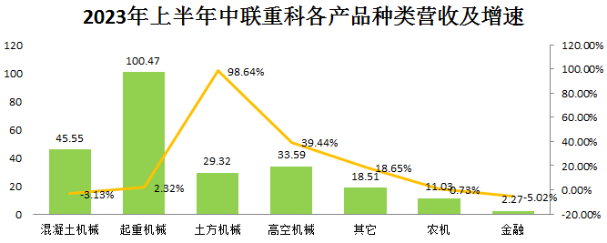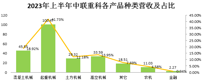 分产品来看,2023年上半年公司主营业务中,起重机械收入100.47亿元,同比增长2.32%,占营业收入的41.73%;混凝土机械收入45.55亿元,同比下降3.11%,占营业收入的18.92%;高空机械收入33.59亿元,同比增长39.46%,占营业收入的13.95%。土方机械收入29.33亿,同比增长+98.72%,占营业收入的12.18%。