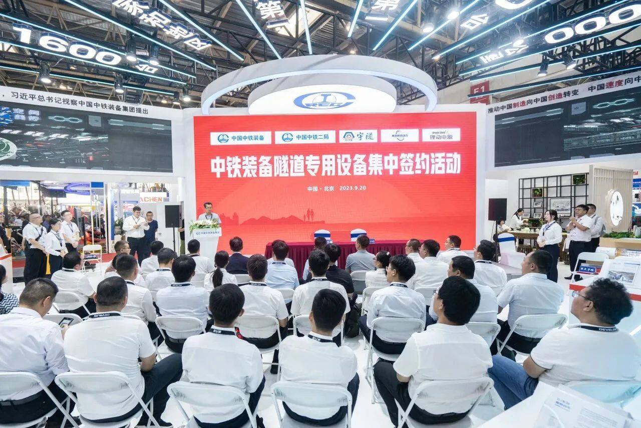当日下午,中铁装备举行隧道专用设备集中签约活动。分别与中铁二局签约7台三臂凿岩台车,与重庆宇隧签约6台悬臂掘进机,与河南锂动、青岛联合动力签约16列水平运输编组。中国工程机械工业协会副秘书长王金星,中铁二局二公司副总经理戴红斌,重庆宇隧总经理刘中林、大项目经理陈龙,青岛联合动力总经理苗富,河南锂动副总经理赵艳华,中铁装备集团党委书记、董事长赵华,副总经理王锴等领导出席,总工程师贾连辉主持签约仪式。