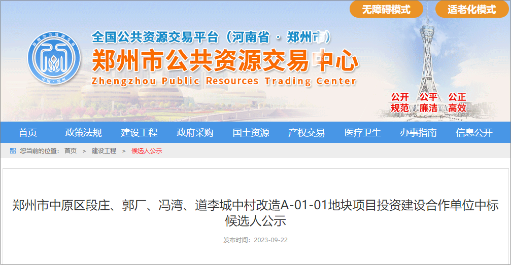 2023年9月23日,郑州市公共资源交易中心发布郑州市中原区段庄、郭厂、冯湾、道李城中村改造A-01-01地块项目投资建设合作单位开标结果,该项目合作期限5年,其中建设期3年,项目投资27.7亿元。