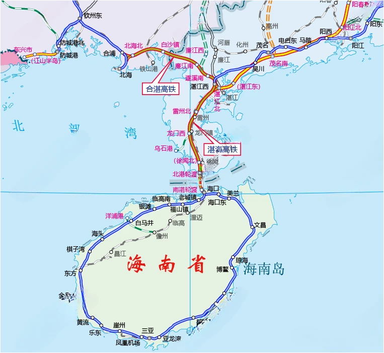 合湛高铁按双线电气化标准设计,施工总工期为4年,自既有邕北线合浦站侧向引出,经北海、山口、廉江、遂溪至湛江西站。